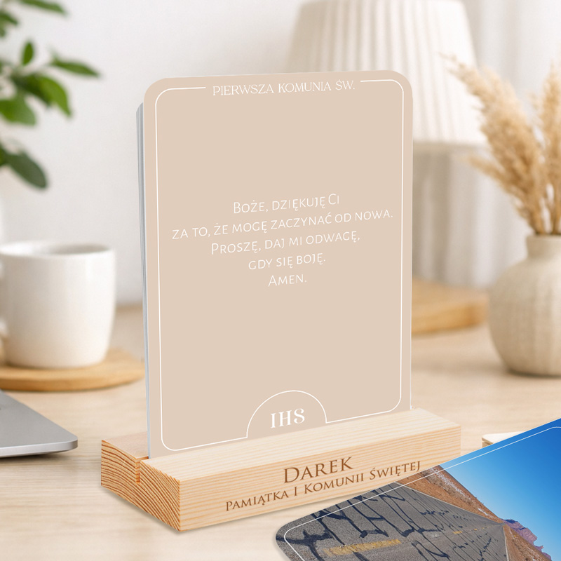 Wyjątkowym elementem zestawu jest drewniana podstawka z personalizacją. Na podstawce umieszczone jest imię dziecka oraz napis „Pamiątka I Komunii Świętej”. Naturalne drewno pięknie komponuje się z jasnymi kartami, a całość doskonale prezentuje się na biurku, komodzie lub półce w pokoju dziecka. Zestaw karty modlitewne z podstawką personalizowaną to elegancka pamiątka komunijna, która łączy modlitwę, personalizację i ponadczasowy charakter prezentu na Pierwszą Komunię Świętą.