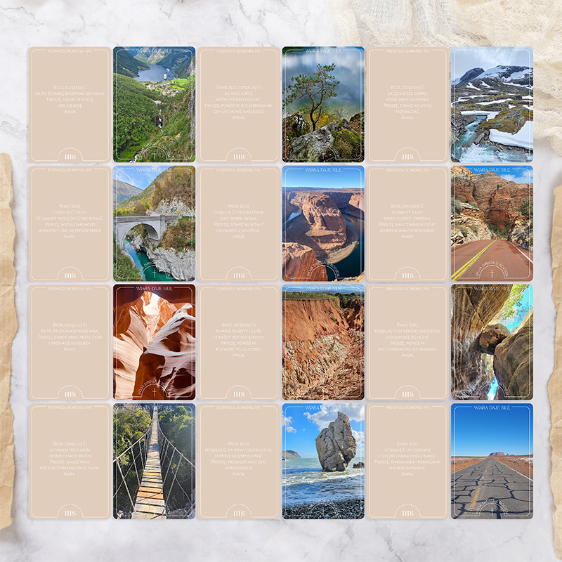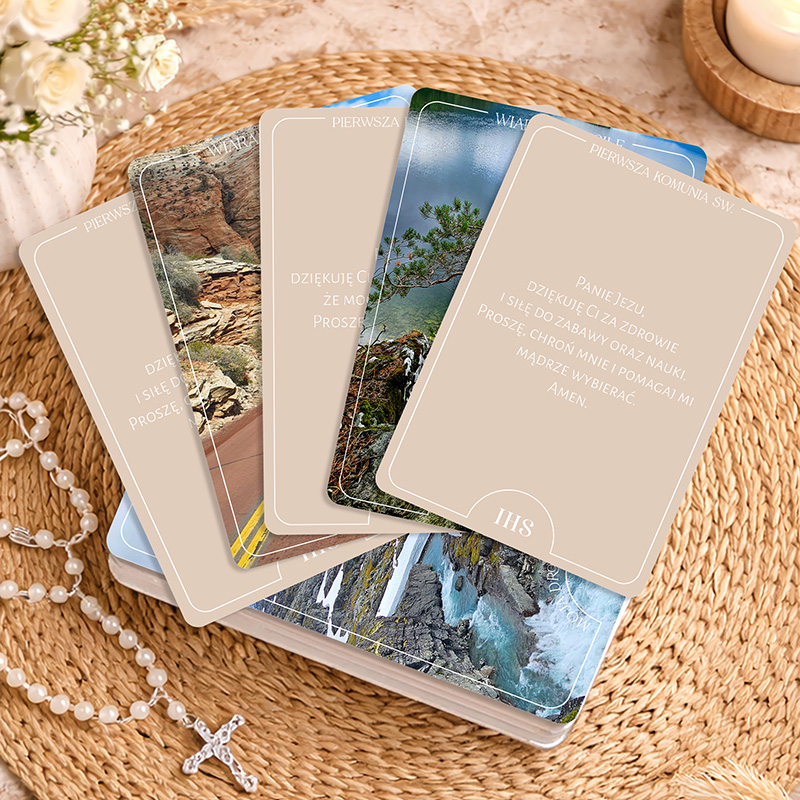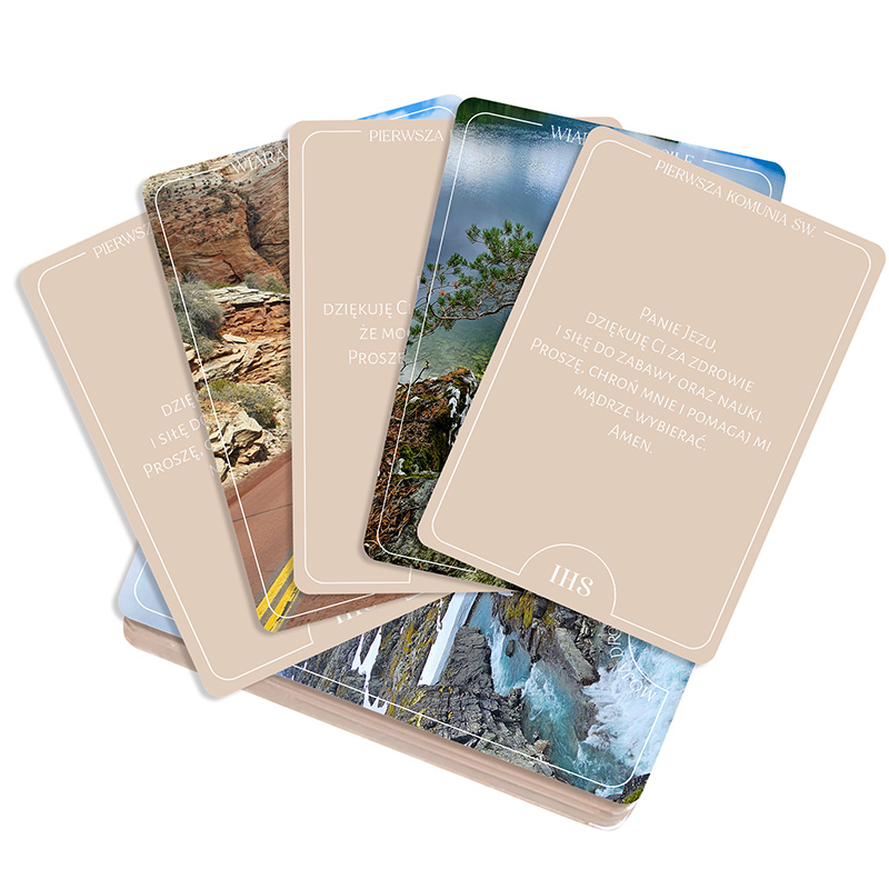 Komplet zawiera starannie przygotowane karty z modlitwami dostosowanymi dla dziecka przystępującego do Pierwszej Komunii Świętej. Każda karta została wykonana z grubszego papieru. Dodatkowo zaokrąglone rogi nadają kartom eleganckiego wykończenia. Na froncie znajduje się modlitwa zapisana czytelną czcionką na jasnym, beżowym tle. Tył kart zdobią starannie dobrane fotografie natury – gór, rzek czy skalistych krajobrazów. Dzięki temu karty modlitewne na Pierwszą Komunię Świętą stają się zbiorem modlitw i inspiracją do refleksji.