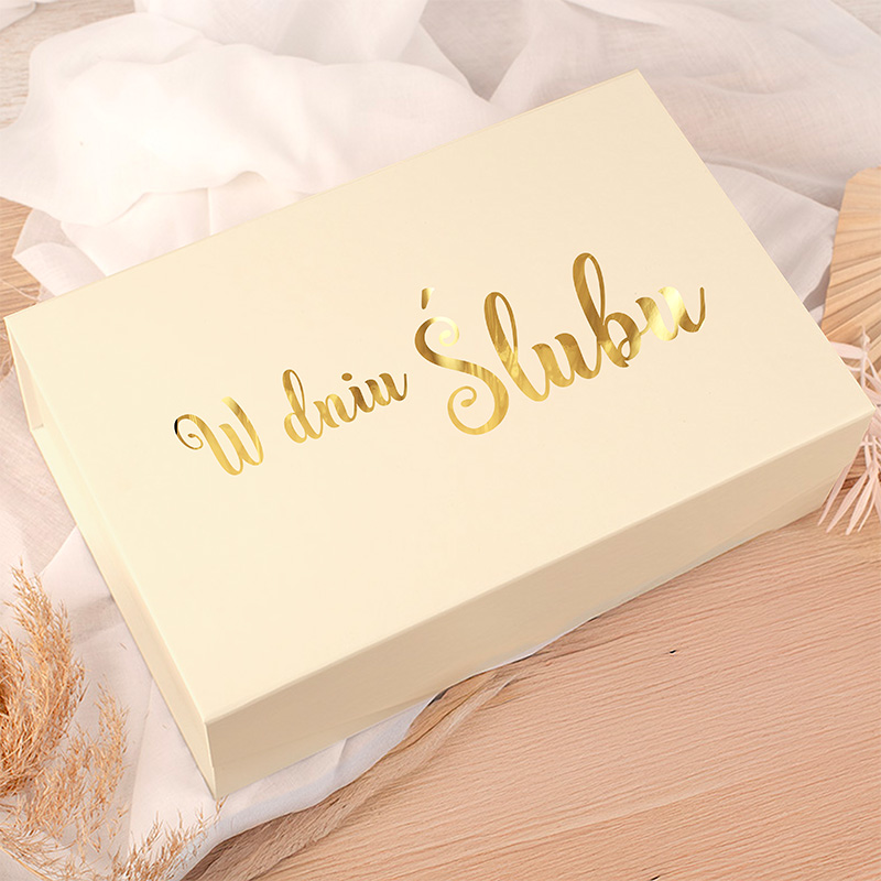 W skład zestawu, wchodzą dwa, eleganckie kieliszki do szampana, ozdobione złotymi, personalizowanymi napisami. Każdy kieliszek jest precyzyjnie wykonany z wysokiej jakości szkła, co zapewnia jego trwałość i wyjątkowy wygląd. Napisy na kieliszkach są umieszczone złotymi, połyskującymi literami, co nadaje im luksusowy charakter i sprawia, że są niepowtarzalne. Całość zestawu jest zapakowana w eleganckie pudełko z magnetycznym zamykaniem wypełnione dekoracyjnymi, białymi różami, które dodają mu romantycznego akcentu. Na pudełku został umieszczony złoty napis “W dniu ślubu”. W zestawie znajduje się również koperta, w której można umieścić osobiste życzenia dla Pary Młodej, a także banknoty jako prezent.