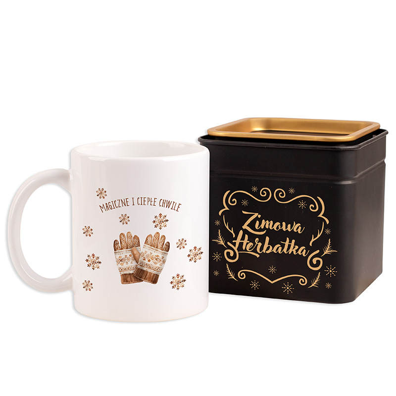 Kubek wykonany został z wysokiej jakości ceramiki. Na białej powierzchni kubka znalazła się grafika z zimowymi rękawiczkami oraz napis „Magiczne i ciepłe chwile”. Grafika jest utrzymana w delikatnych beżowych kolorach. To idealny wybór na leniwe poranki, spokojne wieczory przy książce lub chwile relaksu przy kominku. Do zestawu dołączona została czarna puszka z ozdobnym napisem „Zimowa Herbatka”, który został wykonany elegancką czcionką w stylu retro. Pojemnik ten nie tylko przechowuje ulubioną herbatę, ale również pięknie prezentuje się w kuchni lub na stole. Można go ponownie napełniać i używać wielokrotnie, co czyni go nie tylko estetycznym, ale i praktycznym elementem codziennych rytuałów.