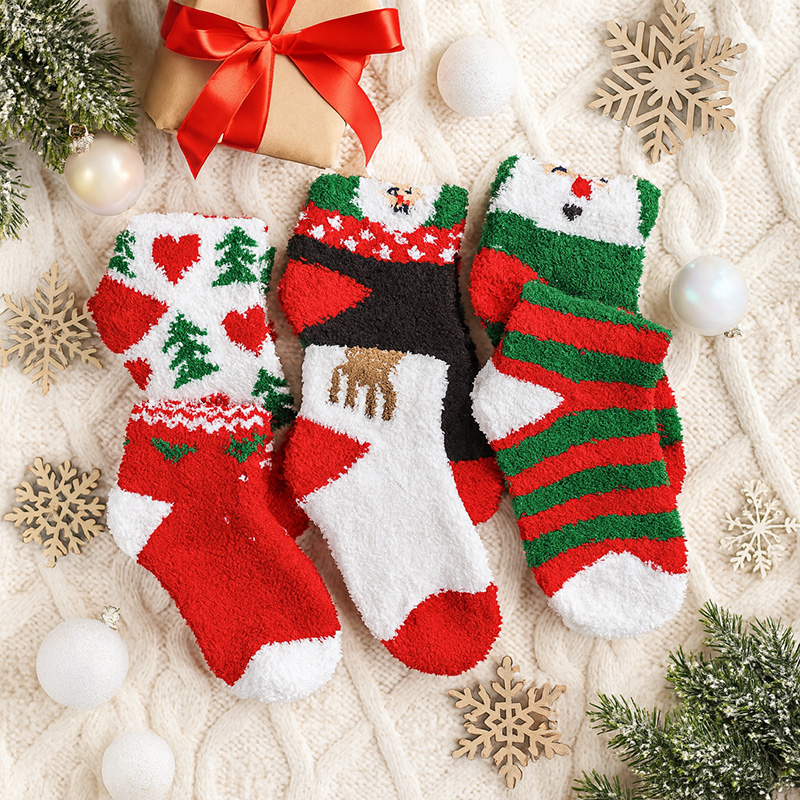 • Skarpety puchate ze świątecznym wzorem wysyłanym losowo. Rozmiar uniwersalny.
