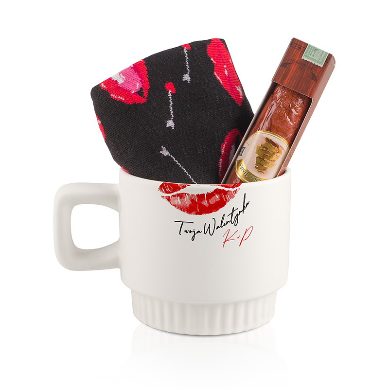 W zestawie znajduje się elegancki kubek ryflowany w białym kolorze – minimalistyczny i nowoczesny. Charakterystyczne ryflowanie sprawia, że kubek prezentuje się wyjątkowo i pasuje do każdego wnętrza. Na kubku znajduje się grafika przedstawiająca usta oraz personalizacja w postaci inicjałów imion pary. Do kompletu dołączone są skarpety z wyrazistym motywem ust, które dodają prezentowi humoru i walentynkowego vibe’u, a całość dopełnia czekoladowe cygaro – nietypowy, efektowny dodatek.