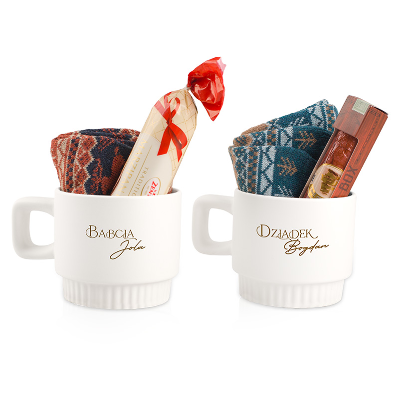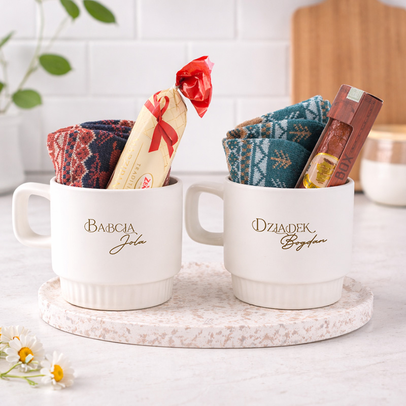 Pomysł na elegancki prezent dla dziadków w postaci kubka ze skarpetami i słodkościami. Do wyboru są trzy warianty, kubki można kupić osobno zarówno dla babci, jak i dla dziadka lub zestaw dwóch kubków. Kubek jest ceramiczny, w białym kolorze. Charakteryzuje się nowoczesnym ryflowaniem oraz personalizacją w postaci imion dziadków. Napisy wykonamy ozdobnymi czcionkami.