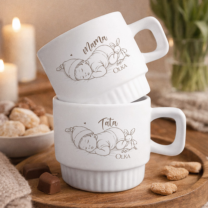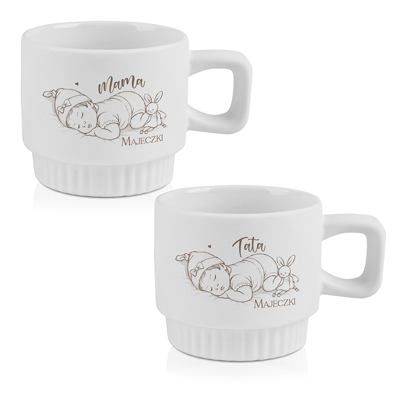Komplet składa się z dwóch eleganckich, ryflowanych kubków – jednego dla Mamy i jednego dla Taty. Każdy z nich ozdobiony jest minimalistyczną grafiką przedstawiającą śpiącego noworodka. Ilustracja dopasowana jest do płci dziecka: dziewczynki lub chłopca.  Kubki są dodatkowo personalizowane imieniem dziecka.