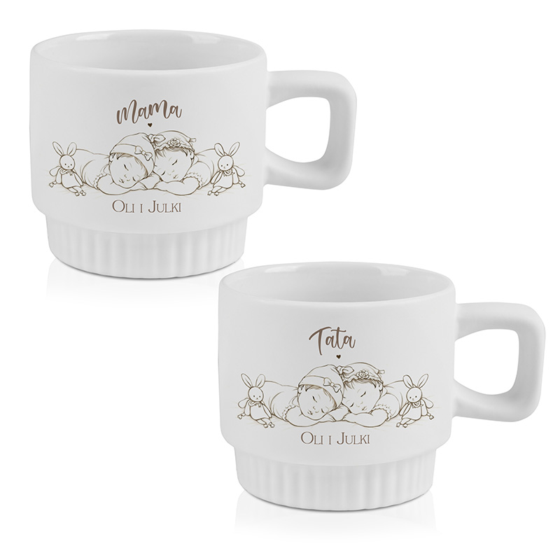 Komplet składa się z dwóch ceramicznych kubków w klasycznym, białym kolorze. Ich dolna część została ozdobiona eleganckim ryflowaniem. W zestawie znajdują się dwa kubki – jeden dla Mamy, drugi dla Taty. Centralnym elementem grafiki jest urocza ilustracja śpiących bliźniaczek w czapeczkach. Nad ilustracją umieszczony jest napis „Mama” lub „Tata”, a poniżej znajdują się imiona dziewczynek. Kubki mogą towarzyszyć rodzicom w codziennych chwilach – podczas porannego planowania dnia, nocnych pobudek czy wspólnego odpoczynku.