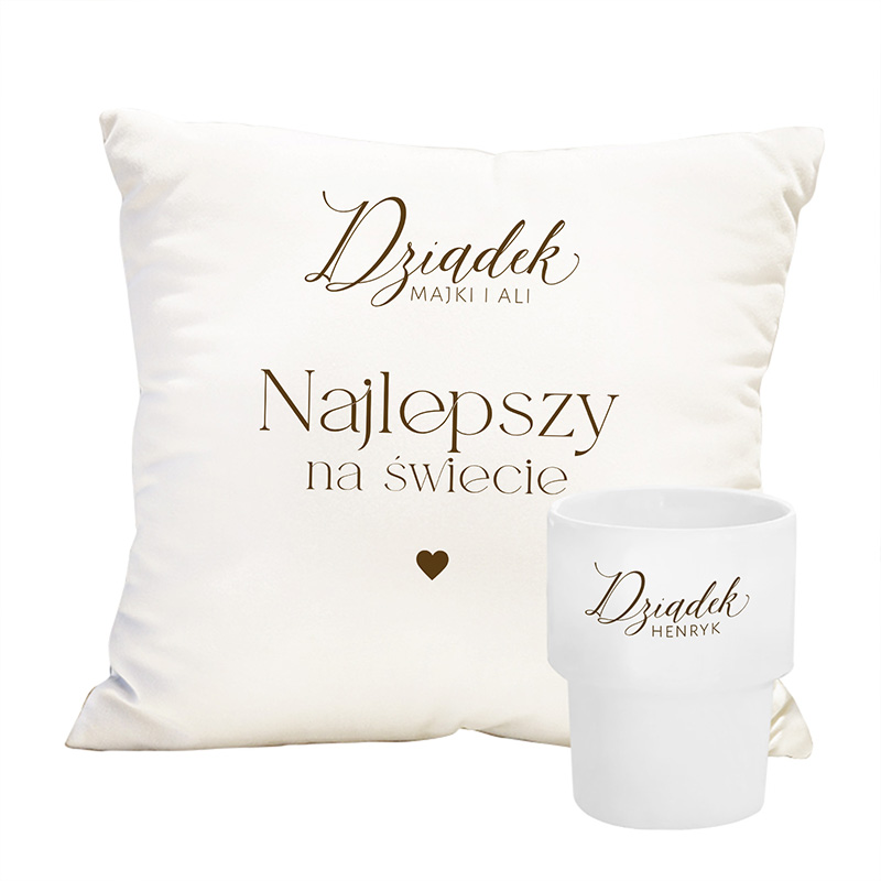 W skład zestawu wchodzi jasna, dekoracyjna poduszka z napisem “Dziadek + Imię wnuka/wnuczki + Najlepszy na świecie”. Całość utrzymana jest w stonowanej, klasycznej stylistyce, dzięki czemu doskonale pasuje do salonu, sypialni lub ulubionego fotela dziadka. Uzupełnieniem zestawu jest dopasowany kubek z napisem “Dziadek” i imieniem, który idealnie sprawdzi się do porannej kawy lub herbaty. Spójny design sprawia, że oba elementy tworzą harmonijną i estetyczną całość.
