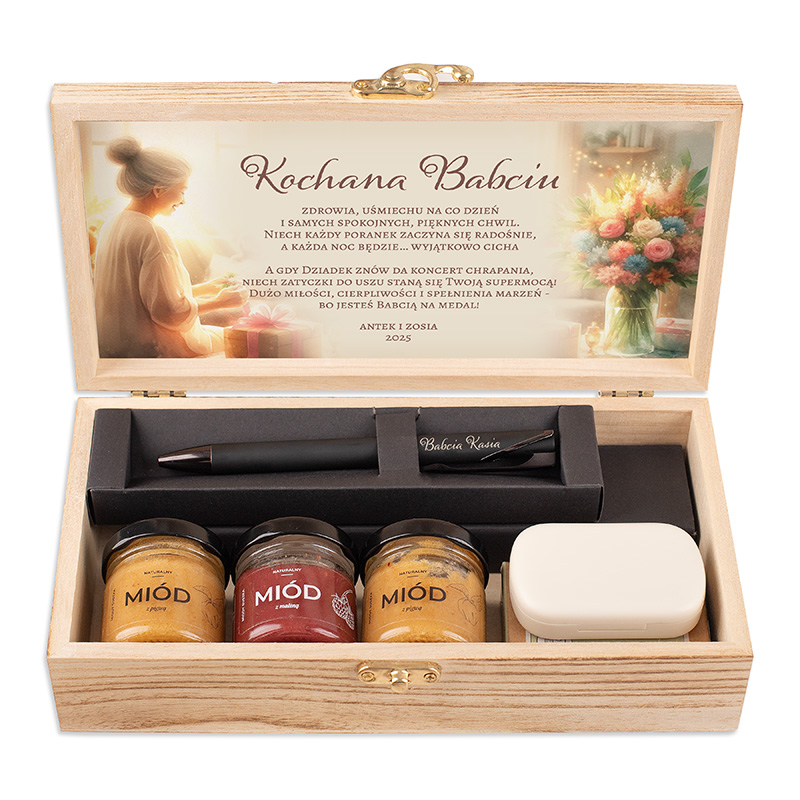Zestaw znajduje się w drewnianej skrzynce z życzeniami skierowanymi do babci, co nadaje prezentowi wyjątkowego, sentymentalnego charakteru. W środku znajdują się trzy słoiczki naturalnego miodu, które doskonale sprawdzą się jako zdrowy dodatek do herbaty lub codziennych posiłków. Całość uzupełnia elegancki, czarny długopis z personalizacją imienia. Do zestawu dołączone są również zatyczki do uszu redukujące hałas, zapewniające komfort i chwilę spokoju podczas odpoczynku.