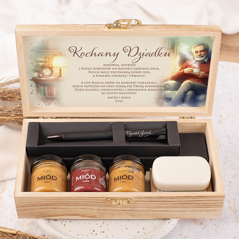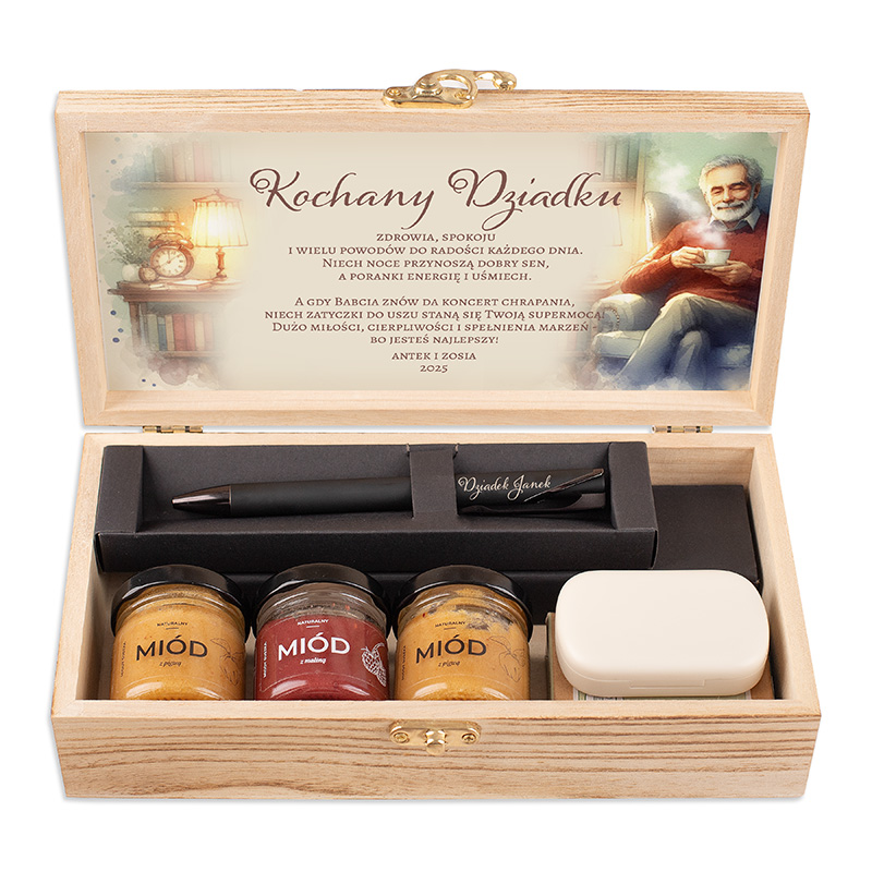 Zestaw zapakowany jest w drewnianą skrzynkę z życzeniami dla dziadka. W jej wnętrzu znajdują się trzy słoiczki naturalnego miodu. Całość uzupełnia elegancki czarny długopis personalizowany imieniem. Dodatkowym elementem są zatyczki do uszu redukujące hałas.