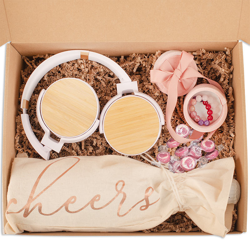 Zestaw prezentowy dla dziewczyny ze słuchawkami łączy praktyczne akcesoria, słodkie dodatki i bezalkoholowe wino musujące w eleganckim pudełku z napisem „Dla Ciebie”.