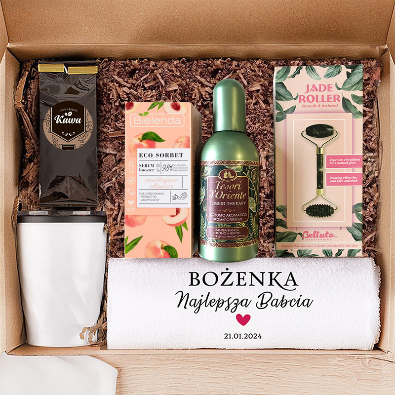 Ekskluzywny zestaw prezentowy dla babci, elegancko zapakowany w stylowe pudełko. To idealna propozycja na prezent urodzinowy, rocznicowy, a także na każdą inną okazję. Wewnątrz tego gustownego boxa znajdują się starannie dobrane kosmetyki, aromatyczna herbata oraz inne akcesoria, tworząc idealny zestaw upominkowy specjalnie dla kobiety. Zestaw zawiera wysokiej jakości produkty kosmetyczne umieszczone w pudełku. Dołączone kosmetyki ułatwiają codzienną pielęgnację skóry, dostarczając jej niezbędnych składników odżywczych. W zestawie znalazła się również aromatyczna kawa. Dodatkowo, w zestawie znajduje się elegancki biały kubek termiczny. Idealny do podtrzymywania temperatury zarówno gorących, jak i zimnych napojów w każdej porze roku. Ręcznik jest praktycznym upominkiem dla babci. Na jego powierzchni umieścimy napis: Imię + Kochana Babcia + Data.