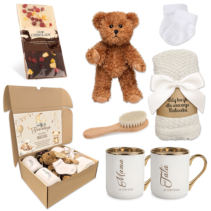 Zestaw prezentowy dla świeżo upieczonych rodziców jest idealnym wyborem dla tych, którzy chcą celebrować narodziny nowego członka rodziny z klasą i ciepłem. Zestaw to starannie dobrana wyprawka dla noworodka, w której znajdziemy wszystko, co sprawi radość zarówno maluszkowi, jak i jego rodzicom. W skład zestawu wchodzi miękki kocyk o jasnym odcieniu, otulający dziecko ciepłem i komfortem od pierwszych dni. Kocyk jest ozdobiony delikatnym splotem, co nadaje mu elegancji i sprawia, że świetnie wygląda w każdej dziecięcej wyprawce. Dodatkowo, w zestawie znajduje się pluszowy miś – wierny towarzysz pierwszych dni życia maluszka. Do zestawu dołączono także białe skarpetki, idealnie dopasowane do małych stópek, oraz szczoteczkę do włosów, bezpieczną dla delikatnej skóry głowy noworodka. W zestawie znalazły się również dwa kubki z eleganckimi złotymi obwódkami – jeden dla mamy, drugi dla taty, z wygrawerowaną datą narodzin dziecka. Kubki to idealny sposób na podkreślenie tego wyjątkowego momentu, a także praktyczny dodatek do codziennych rytuałów.
