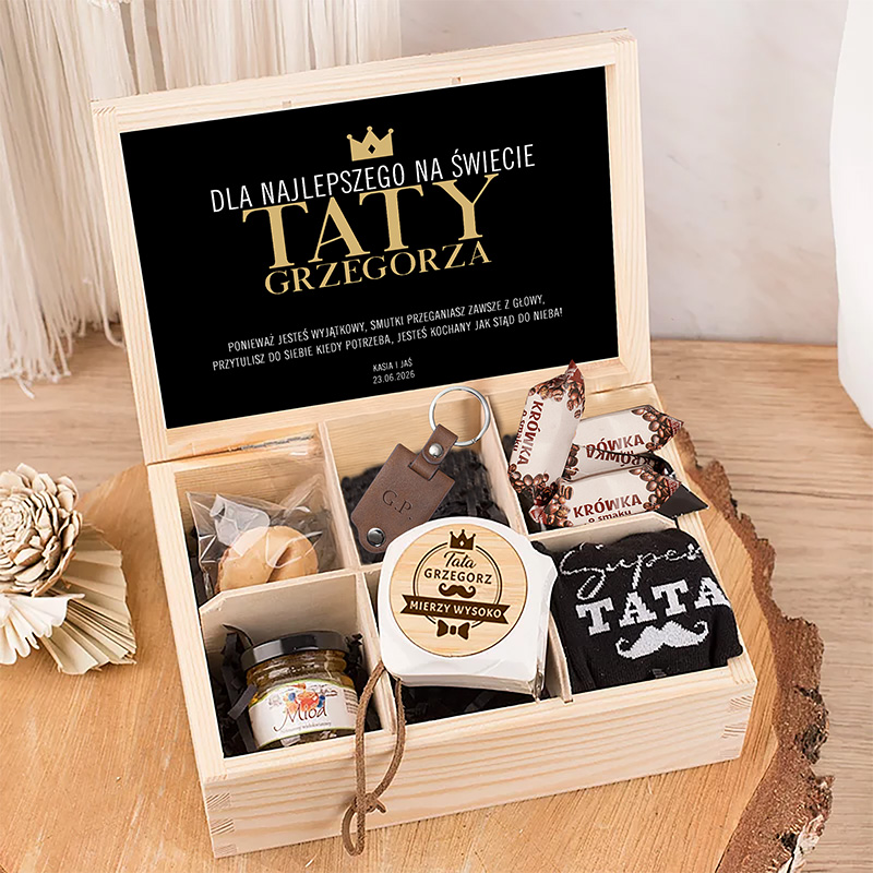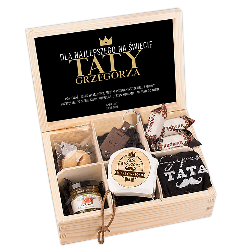 Zestaw prezentowy dla taty z upominkami w drewnianym pudełku. Wewnątrz znajduje się 6 przegródek, a każda z nich zawiera inny drobiazg. Bambusowa miarka przyda się podczas majsterkowania. W zestawie znalazł się również wyjątkowy skórzany brelok z inicjałami i zdjęciem. Krówki zaskoczą smakiem mocnej kawy i zimnego chmielu. Skarpety męskie z zabawnym nadrukiem to z kolei praktyczny i przydatny element garderoby, który zapewni ciepło i komfort. Miód sprawdzi się jako naturalny słodzik, a ciasteczko z wróżbą dostarczy rozrywki. Pod wieczkiem umieścimy wlepkę z dedykacją i personalizacją.