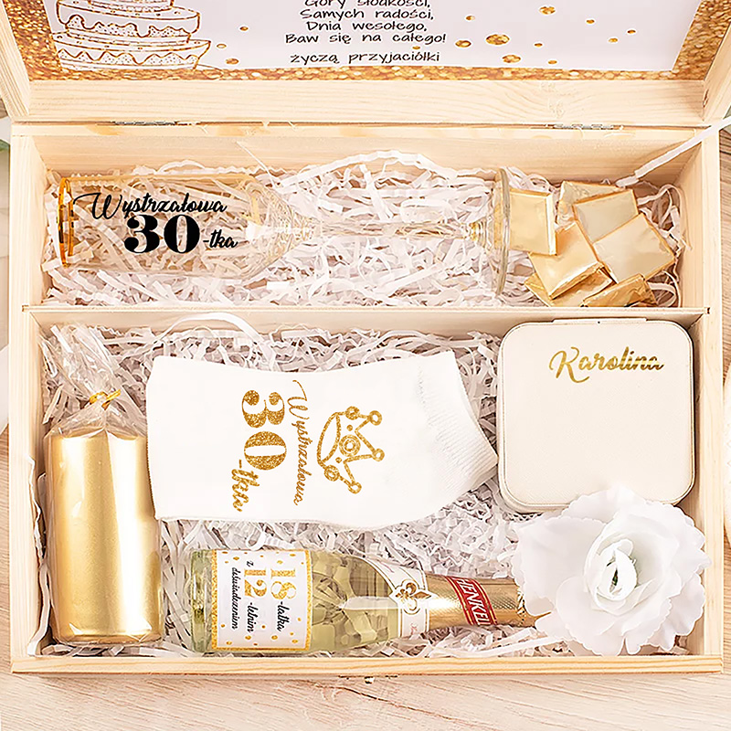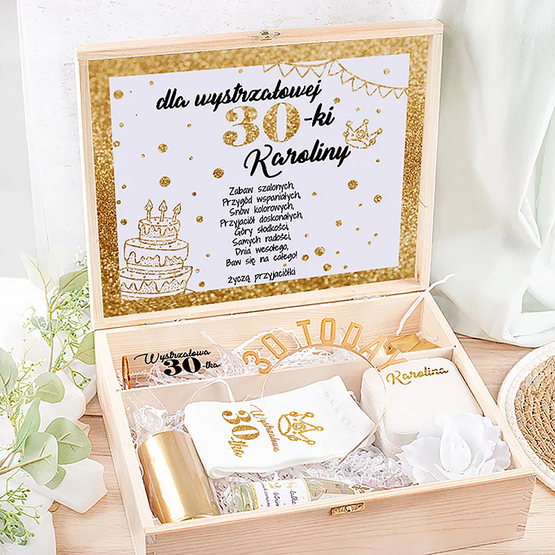 ZESTAW prezentowy dla Wystrzałowej 30-tki w drewnianej skrzyni