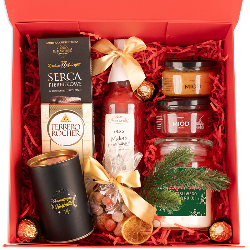 W zestawie znajduje się świąteczna świeca zapachowa z etykietą “Wesołych Świąt i Szczęśliwego Nowego Roku” oraz elegancka puszka z herbatą z napisem „Aromatyczna Herbatka”. W zestawie umieszczono również dwa słoiczki miodu – smaki wysyłane są losowo spośród takich jak: malina, pigwa, orzechy laskowe czy kakao. Każdy z nich to naturalny produkt o pysznym smaku. Mus malinowo-truskawkowy to kolejna słodka niespodzianka, sprawdzi się jako dodatek do herbaty lub jako dodatek do deserów. Dla fanów świątecznych smaków przygotowano również pierniki w kształcie serc oblane czekoladą oraz czekoladki Ferrero Rocher. Całość uzupełnia woreczek z orzechami, przewiązany złotą wstążką.