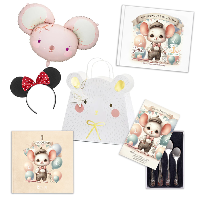 Praktycznym dodatkiem w zestawie jest komplet sztućców: widelec, nóż, łyżka i łyżeczka. Każdy element ozdobiony jest drobnymi grafikami zwierzątek, a na uchwycie wygrawerowane zostaje imię dziecka. Sztućce zapakowane są w ozdobne pudełko, którego front zdobi myszka w towarzystwie pastelowych balonów – dzięki temu całość wygląda elegancko i spójnie z pozostałymi elementami zestawu. Balon foliowy w kształcie różowej myszki ma duże, okrągłe uszy i sympatyczny pyszczek. Odcienie różu i bieli uzupełniają się tutaj z subtelnymi akcentami w kolorze fioletu i brzoskwini. To dekoracja, którą można napełnić helem, by unosiła się nad stołem, lub wykorzystać jako ozdobę pokoju dziecka. Opaska z uszami i kokardą ma charakterystyczne czarne uszka oraz dużą, czerwoną kokardę w białe groszki. Ten dodatek dobrze wpisuje się w bajkową stylistykę i świetnie prezentuje się podczas przyjęcia oraz na zdjęciach.