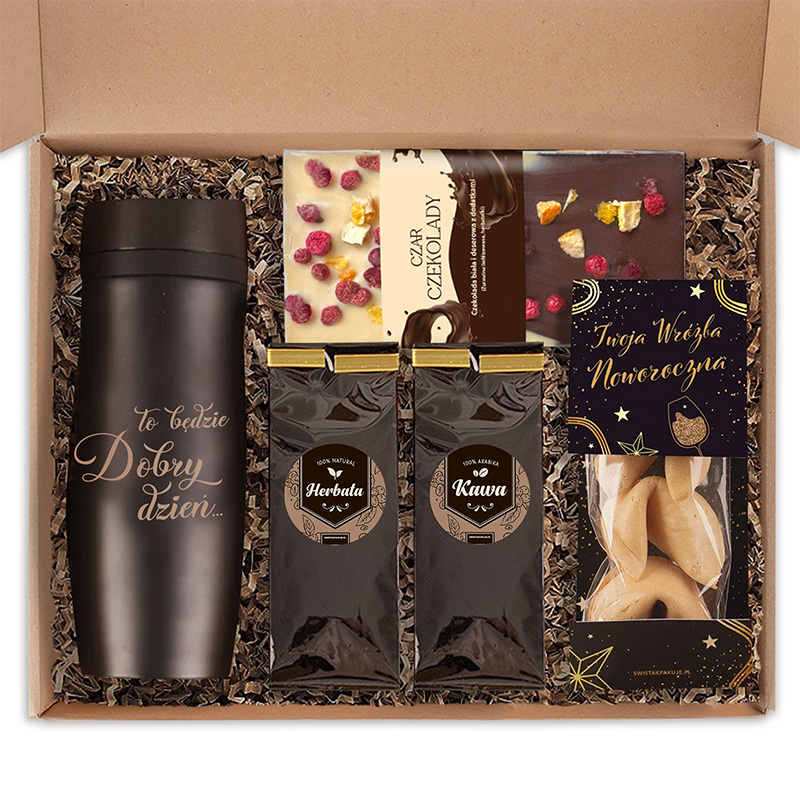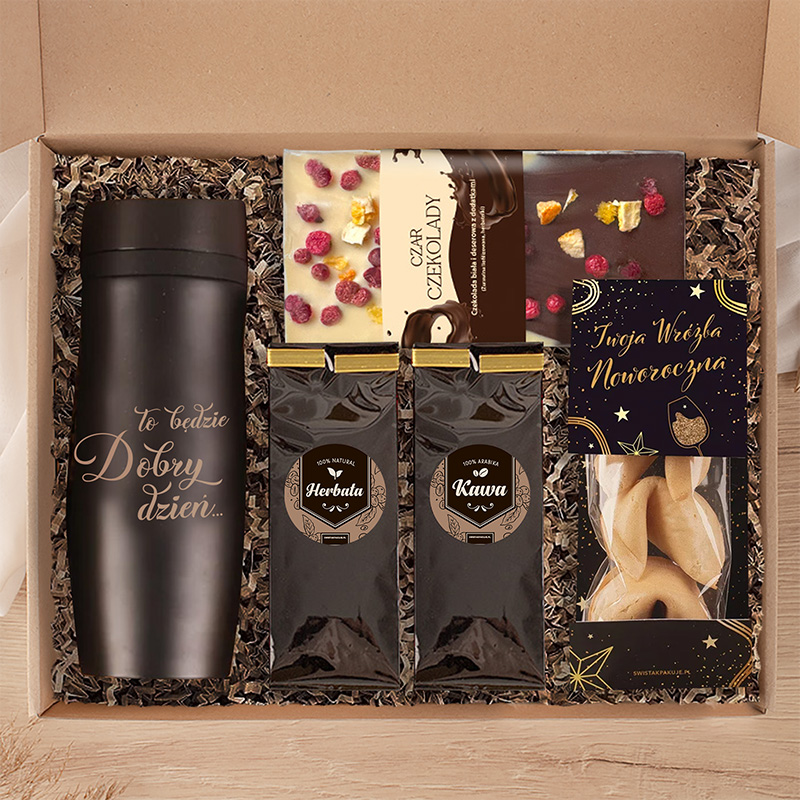 Zestaw prezentowy na święta zawiera cztery elementy, które z pewnością przypadną każdemu do gustu. Głównym punktem jest tutaj kubek termiczny z dedykowanym napisem, dzięki któremu już niejeden poranek będzie dużo przyjemniejszy. Dodatkowo opakowanie zawiera kawę i herbatę, elegancko zapakowane czekoladki z białej i mlecznej czekolady oraz zestaw trzech ciastek z wróżbą. Tak słodka oprawa sprawi, że zaparzona kawa lub herbata będzie smakować jeszcze lepiej.
