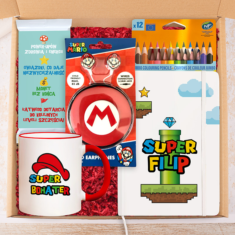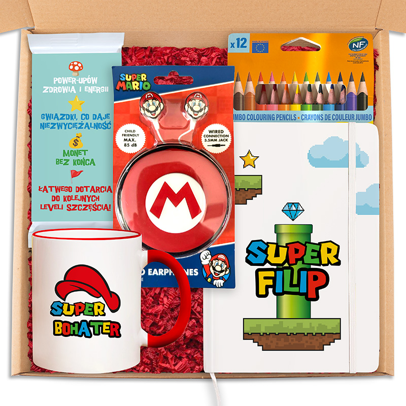 Zestaw zawierający kubek z napisem 'SUPER BOHATER', słuchawki z motywem Super Mario, zestaw 12 kredek oraz zeszyt z grafiką przedstawiającą rurę z gry. Całość umieszczona w kartonowym pudełku wypełnionym ścinkami papieru.