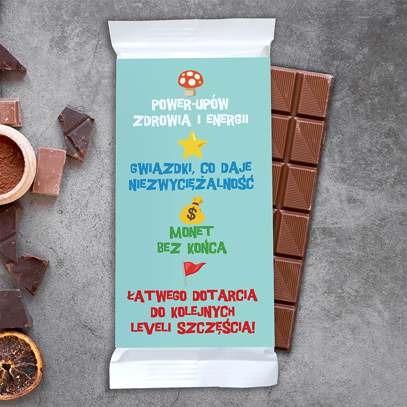 • Czekolada mleczna w opakowaniu z motywem Super Mario, wymiary ok. 8 × 18 cm, waga 100 g