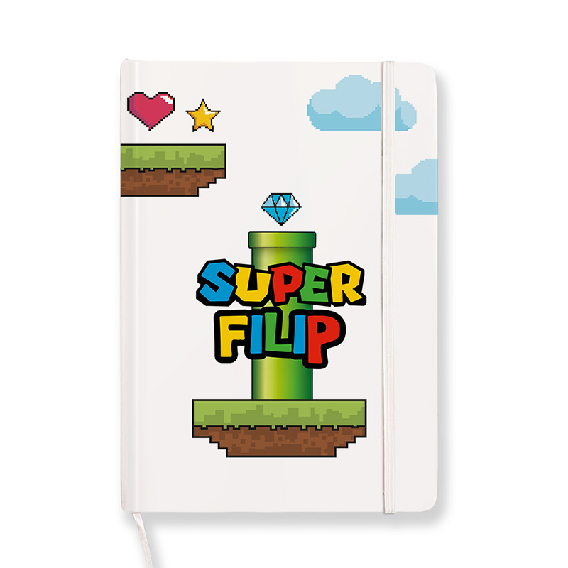 • Notes personalizowany z imieniem, format A5, 96 kartek w kratkę, wymiary 21 × 14 × 1,5 cm, nadruk UV, wstążka i gumka zabezpieczająca