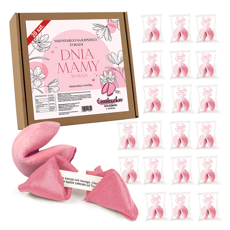 Zestaw zawiera 20 ciasteczek w różowym kolorze. Ciasteczka wypiekane są z wysokiej jakości składników w Polsce, dlatego są chrupiące i smaczne. Ciasteczka są zapakowane pojedynczo w przezroczystą folię. Dodatkowo do ciasteczek dołączone są eleganckie etykiety z napisem „Dzień Mamy 26 maja” oraz subtelnym motywem kwiatowym, dzięki czemu całość prezentuje się niezwykle kobieco. Wewnątrz każdego ciasteczka znajduje się karteczka z pozytywną wróżbą. Całość zapakowana jest w pudełko z ozdobną naklejką na wieczku pudełka.