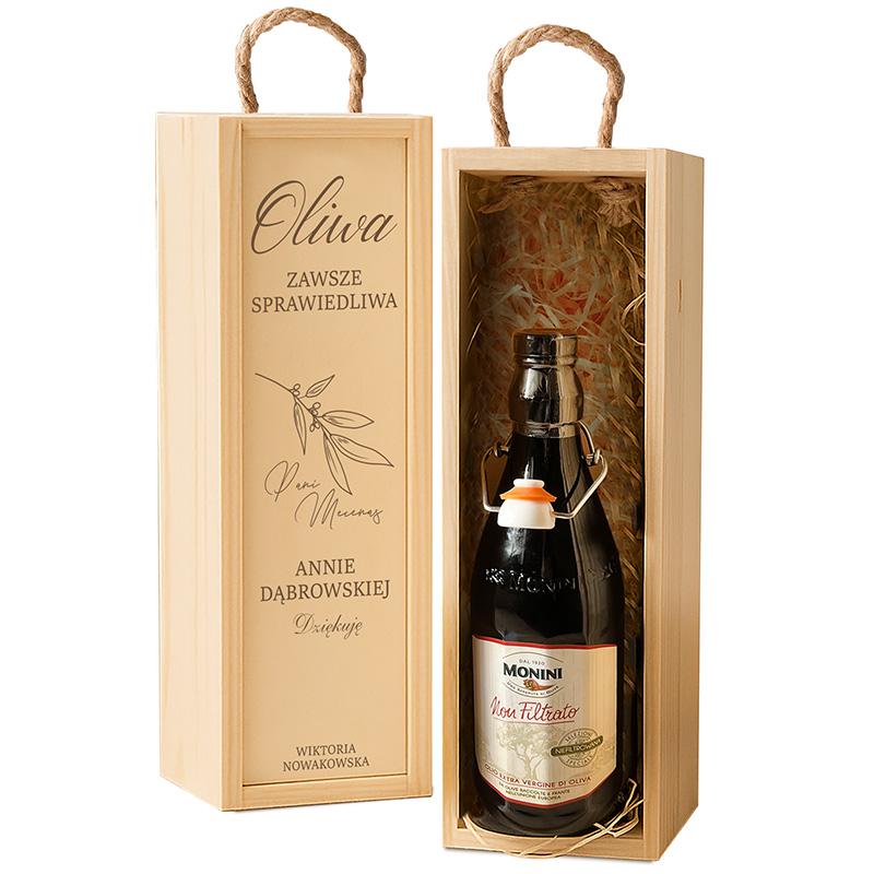 Zestaw prezentowy składa się z wysokiej jakości oliwy z oliwek Monini Extra Vergine Non Filtrato oraz eleganckiej drewnianej skrzynki z grawerem. Butelka oliwy została umieszczona w drewnianej skrzynce z dekoracyjnym wypełnieniem, dzięki czemu zestaw prezentuje się estetycznie i jest gotowy do wręczenia bez potrzeby dodatkowego pakowania. Na skrzynce znajduje się grawer z imieniem oraz dedykacją: