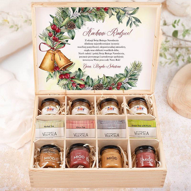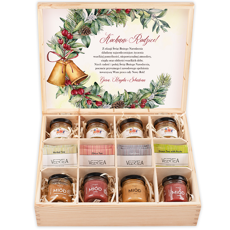 Karta z życzeniami, która znajduje się po wewnętrznej stronie wieczka, ma bardzo ozdobny i świąteczny wygląd, zarówno treść jest napisana dekoracyjnym fontem, jak i grafika, którą je dopełnia ma przepiękny, świąteczny wygląd. Życzenia otula świąteczny stroik z jodłowych gałązek, owoców ostrokrzewu oraz szyszek. Skrzynka świąteczna spiżarka to idealny upominek pod choinkę dla rodziców lub dziadków. Dzięki zawartości zimowe wieczory nabiorą smaku miodu oraz owoców, a gorąca herbatka rozgrzeje najbliższych. Drewniana szkatułka z przegródkami można potem wykorzystać na przechowywanie pamiątek świątecznych, a życzenia na wieczku będą nośnikiem wspomnień tegorocznych świąt. Klimatyczny prezent w wyjątkowej aranżacji zrobi wrażenie na każdej osobie, której podarujecie skrzynkę z zapasami na zimę.