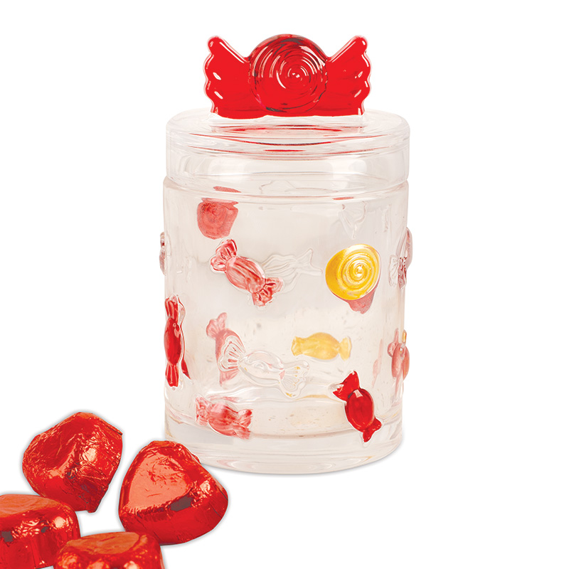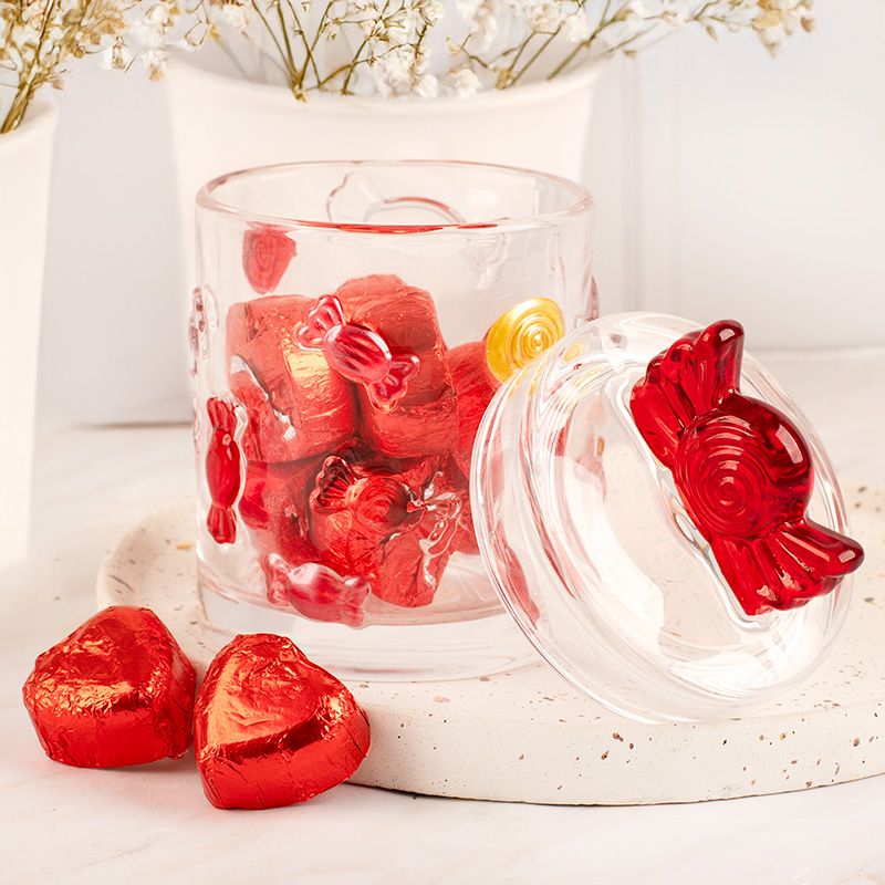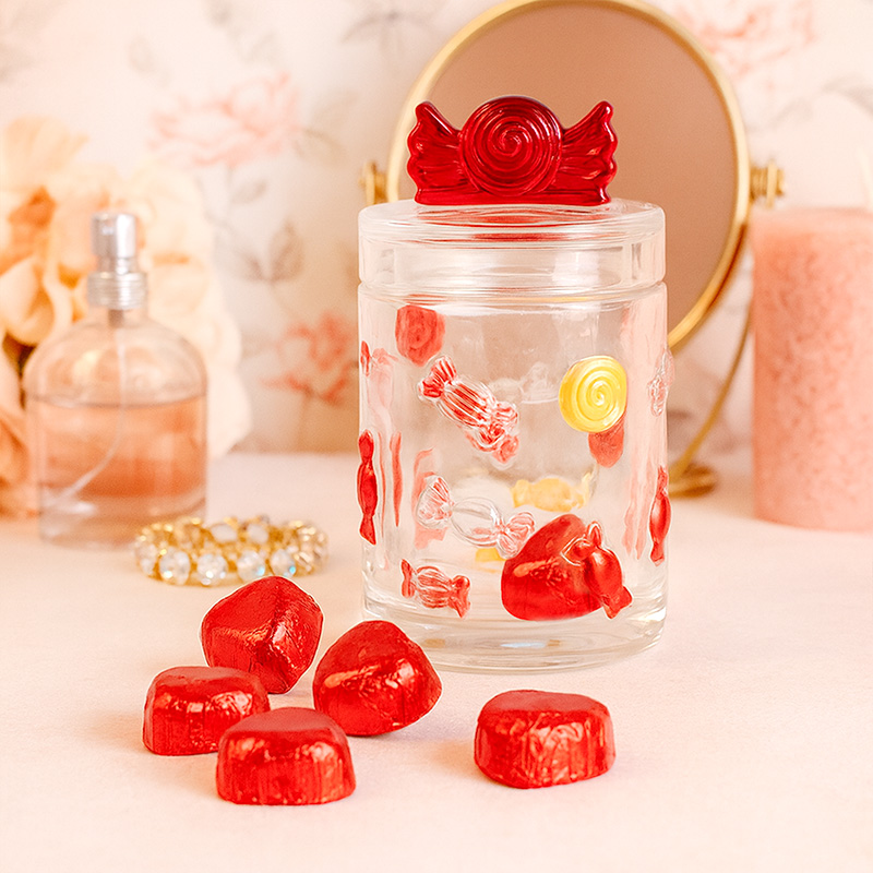 Zestaw zawiera szklany słoik ozdobiony motywami cukierków oraz 10 czekoladowych serc. Słoik wykonano z trwałego, transparentnego szkła, które umożliwia efektowną ekspozycję zawartości. Jego pokrywka posiada wygodny uchwyt w kształcie cukierka, nadając całości słodkiego charakteru oraz ułatwiając codzienne użytkowanie. Po zjedzeniu słodyczy słoik może pełnić funkcję praktycznego pojemnika na drobne przekąski, biżuterię, kosmetyki lub inne małe skarby.