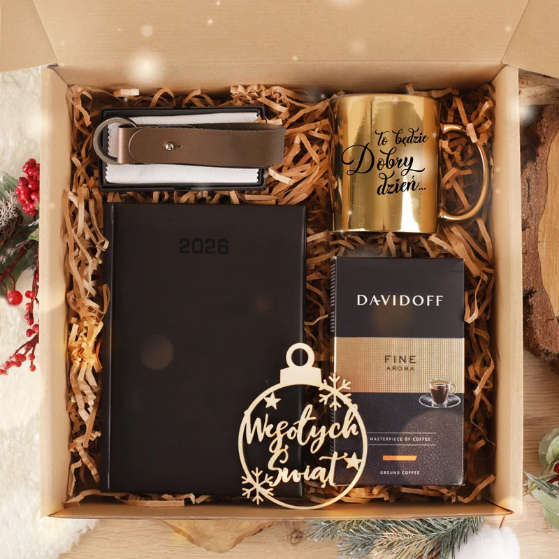 Kalendarz książkowy, kawa, brelok i kubek są świetnymi upominkami dla zapracowanych osób, które lubią mieć wszystko pod kontrolą. Pijąc wyśmienitą kawę ze specjalnego złotego kubka zwiastującego kolejny dobry dzień, na pewno poczują, że nic nie wymyka im się spod kontroli. Kubek pomieści większą ilość napoju, a co za tym idzie – nie trzeba odrywać się od pracy, aby zrobić przerwę na kawę. W kalendarzu w wygodnym książkowym formacie oprócz siatki terminarza są kartki przeznaczone na własne notatki, dlatego obdarowany może na bieżąco kontrolować wszystkie zadania i nic nie umknie jego uwadze. Czarny skórzany brelok przyda się zarówno kobietom jak i mężczyznom, dzięki uniwersalnemu zastosowaniu. A dołączona do wytwornego pudełka świątecznego, bombka choinkowa wprowadza gwiazdkowy klimat.