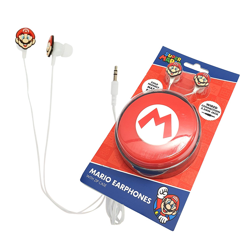 - Słuchawki dokanałowe Super Mario, połączenie przewodowe (jack 3,5 mm), dodatkowo etui na zamek błyskawiczny