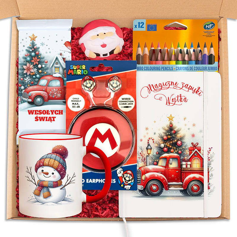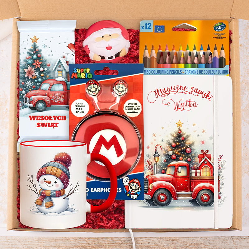Świąteczny zestaw ze słuchawkami Super Mario to propozycja, która łączy w sobie praktyczne drobiazgi, jak i te, które wprowadzą dziecko w świąteczny nastrój. W środku dziecko znajdzie personalizowany notes z imieniem – miejsce, w którym można zapisywać pomysły, rysować, prowadzić świąteczne listy, a także wykorzystywać go w szkole do codziennych notatek. Okładka ozdobiona motywem czerwonego auta z prezentami i choinką wprowadza od razu w świąteczny nastrój, a personalizacja sprawia, że notes nabiera osobistego charakteru i jest przygotowany z myślą o dziecku. Do zestawu dołączono także świąteczny kubek z uśmiechniętym bałwankiem w czapce i szaliku. Dzięki czerwonym akcentom – uchu i rantowi – kubek ma zimowy charakter i świetnie pasuje do klimatu Bożego Narodzenia. Świetnie sprawdzi się na ulubioną czekoladę, mleko czy herbatkę, którą dziecko będzie mogło pić w ciepłej, rodzinnej atmosferze przy choince. Obok praktycznych akcesoriów znalazła się także mleczna czekolada w ozdobnym opakowaniu z grafiką czerwonego samochodu w zimowej scenerii. To świąteczny element zestawu, który stanowi słodki dodatek i urozmaica całość prezentu.