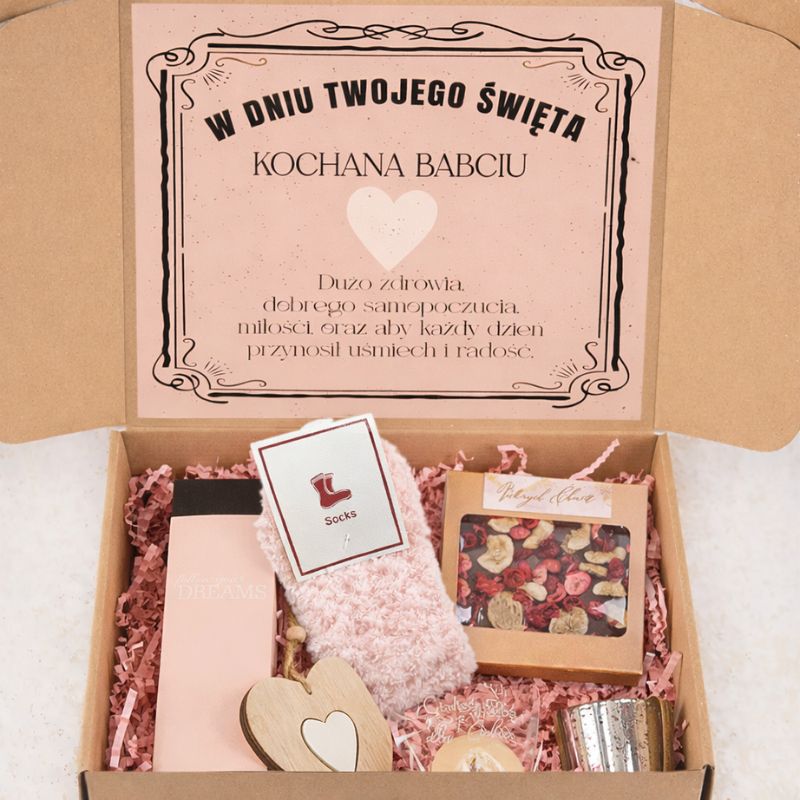 Każdy element zestawu został starannie dobrany, aby stworzyć harmonijną całość. Wszystko zapakowano w eleganckie pudełko wypełnione różowym, dekoracyjnym wypełniaczem. To nie tylko prezent, ale także wyraz troski, miłości i pamięci. Zestaw upominkóe dla babci to coś więcej niż podarunek – to sposób na wyrażenie wdzięczności i ciepłych uczuć. Babcia z pewnością poczuje się wyjątkowa, otwierając ten pełen uroku box. Każdy detal został zaprojektowany z myślą o tym, by wywołać uśmiech i sprawić radość.