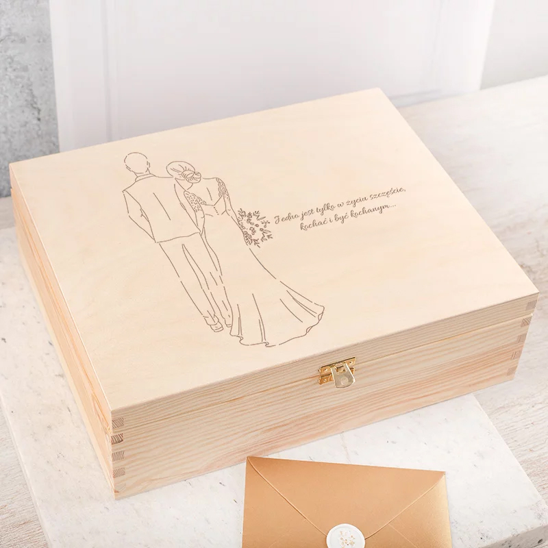 Skrzynia wykonana została z naturalnego drewna, co nadaje jej ponadczasowej elegancji. Na zewnętrznej stronie wieczka znajduje się subtelny grawer przedstawiający parę młodą. Po otwarciu skrzyni oczom ukazuje się starannie skomponowana zawartość. W środku znajduje się zestaw akcesoriów do sera w eleganckim, drewnianym pudełku z personalizowanym grawerem imion pary młodej i daty ślubu. W skład kompletu wchodzi nożyk, widelec do sera oraz korkociąg, które świetnie sprawdzą się podczas romantycznych wieczorów i spotkań towarzyskich. Oprócz tego w skrzyni umieszczono dwa kieliszki. Dodatkowo w zestawie znalazła się tabliczka czekolady z dodatkami, która nadaje całości słodkiego akcentu. Całość uzupełnia elegancka koperta, która daje możliwość umieszczenia pieniędzy lub karty podarunkowej.