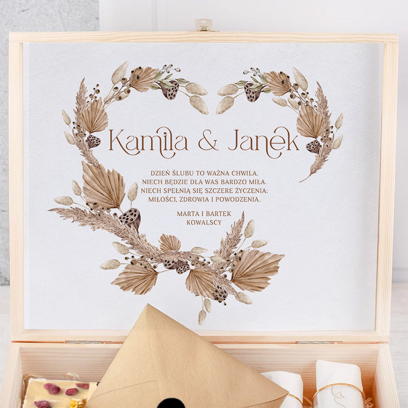 Wewnętrzna strona wieczka skrzyni ozdobiona została motywem kwiatowym oraz życzeniami. Dzięki personalizacji imionami i datą ślubu, skrzynia zyskuje niepowtarzalny charakter, a młoda para może zachować ją jako wyjątkowy symbol dnia, w którym rozpoczęli wspólną drogę. Zestaw w drewnianej skrzyni – elegancki prezent na ślub to propozycja dla osób, które chcą wręczyć coś więcej niż standardowy upominek. Łączy w sobie elementy praktyczne i dekoracyjne, a dzięki pięknej formie oraz możliwości personalizacji wyróżnia się spośród innych prezentów ślubnych. To idealny wybór zarówno dla rodziny, jak i przyjaciół czy świadków, którzy chcą podarować młodej parze coś wyjątkowego.