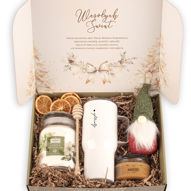 W zestawie znalazł się biały kubek termiczny z imieniem osoby obdarowanej. Kubek jest pojemny, z wygodnym uchem i zakrętką – idealny na zimowe spacery, drogę do pracy czy chwile relaksu z książką. Długo utrzymuje temperaturę napoju. Nieodłącznym elementem zimowego relaksu jest świeca zapachowa zamknięta w szklanym słoiku z wieczkiem. Dopełnieniem zestawu jest naturalny miód smakowy oraz drewniany nabierak do miodu. W zestawie znalazła się również dekoracja w postaci świątecznego skrzata.