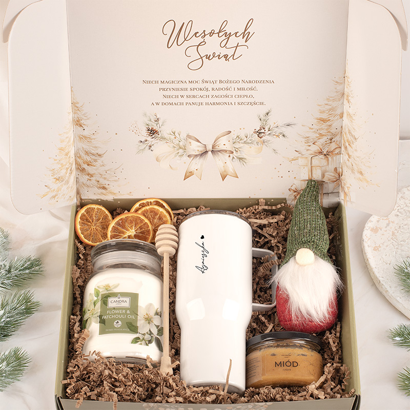 Ekskluzywny zestaw świąteczny z kubkiem termicznym, świecą zapachową, miodem i świątecznymi dodatkami. To gotowy prezent na Boże Narodzenie dla niej i nie tylko.
