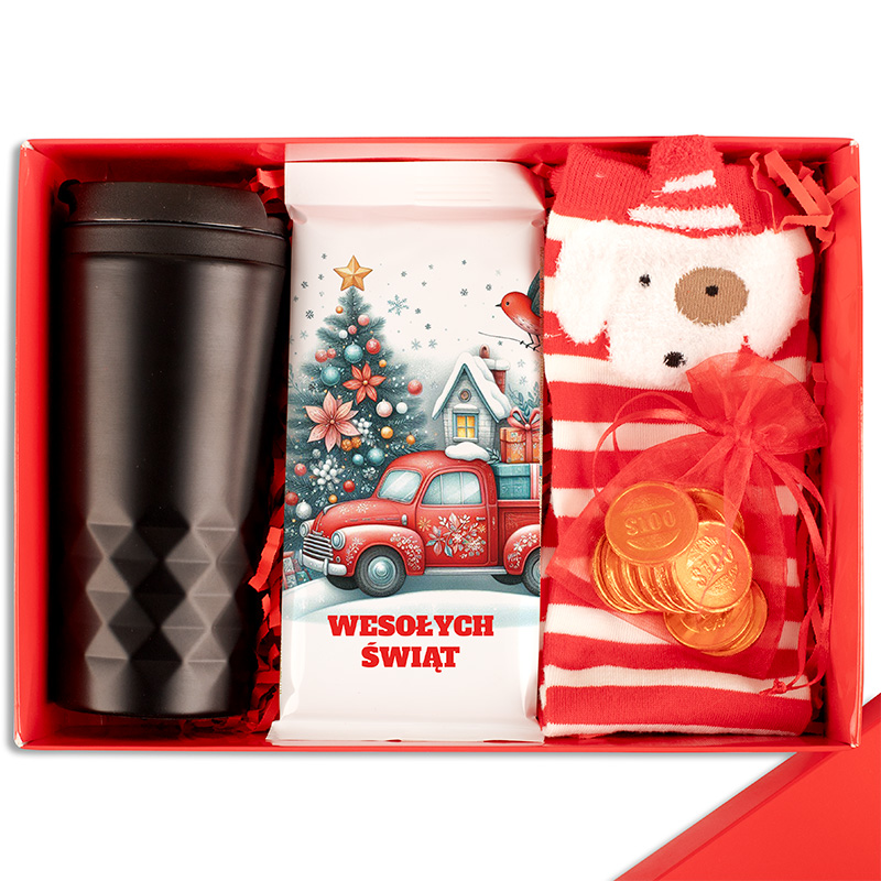 Zestaw zapakowany jest w eleganckie, czerwone pudełko prezentowe. W środku czekają dopracowane elementy, które tworzą spójną, zimową kompozycję. W zestawie znajduje się kubek termiczny w czarnym kolorze. Kubek został wykonany ze stali nierdzewnej. Dodatkowo kubek posiada podwójne ścianki i utrzymuje temperaturę gorących napojów przez kilka godzin. W zestawie znalazły się także słodkie elementy czekolada świąteczna z motywem czerwonego samochodu i choinki. Kolejnym słodkim dodatkiem są czekoladowe monety w czerwony woreczek z organzy. Zestaw dopełniają skarpetki świąteczne. Skarpetki są miękkie i ciepłe – idealne do założenia w chłodne, zimowe wieczory.