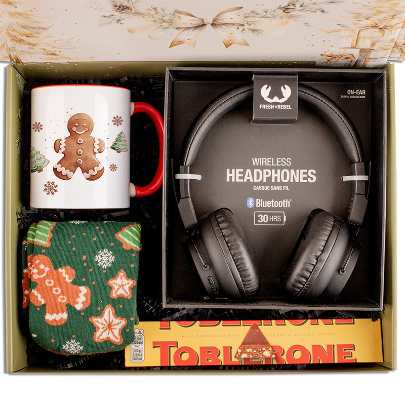 W centrum zestawu znajdują się nowoczesne słuchawki bezprzewodowe na Bluetooth, które zapewniają długie działanie na jednym ładowaniu. To wygodne słuchawki nauszne w kolorze czarnym. Doskonale sprawdzą się podczas słuchania ulubionej muzyki, podcastów czy grania w gry. Kolejnym elementem zestawu jest kubek z czerwonym uchem i motywem piernikowego ludzika. To świąteczna klasyka, kubek można używać na co dzień do herbaty, kakao czy gorącej czekolady. W zestawie nie zabrakło także miękkich i ciepłych skarpetek z motywem świątecznym. Dopełnieniem całego zestawu jest pyszna, klasyczna czekolada Toblerone.