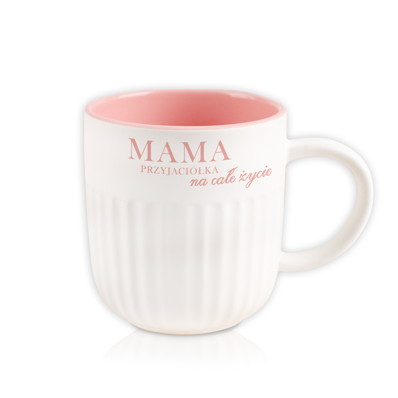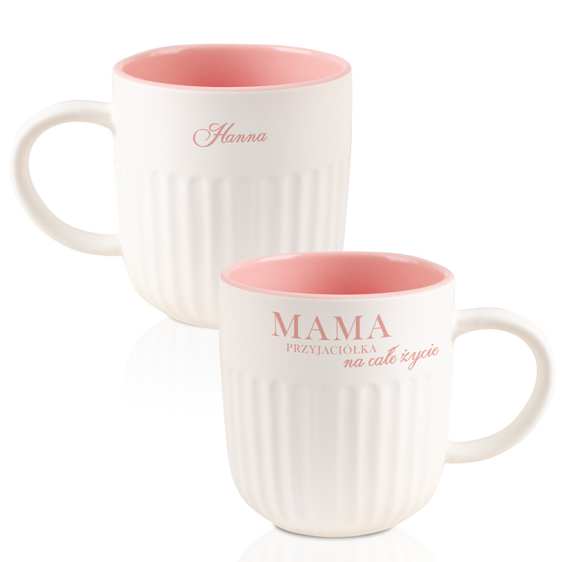 Kubek wyróżnia się dekoracyjną, żłobioną strukturą oraz pastelowym wnętrzem w odcieniu różu, które nadaje mu nowoczesnego i stylowego wyglądu. Na kubku znajduje się napis: “Mama przyjaciółka na całe życie”. Personalizacja imieniem sprawia, że prezent staje się jeszcze bardziej osobisty i dopasowany do obdarowanej osoby. Wygodne ucho oraz solidne wykonanie zapewniają komfort użytkowania każdego dnia.