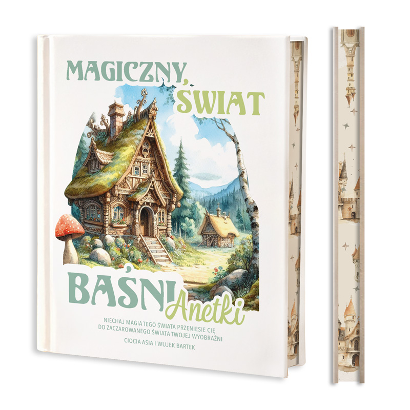 Okładkę książki zdobi ilustracja przedstawiająca bajkowy domek ukryty wśród zielonych wzgórz i lasów. Na okładce znajduje się także imię dziecka, dzięki czemu książka staje się wyjątkowym i personalizowanym prezentem. Taki element sprawia, że dziecko czuje, że książka została przygotowana specjalnie dla niego. Dodatkowo na okładce znajdują się gotowe życzenia oraz personalizowany podpis. Książka posiada twardą oprawę oraz pięknie zdobione brzegi stron. W środku książki znajdują się znane i lubiane baśnie, takie jak: “Czerwony kapturek”, “Jaś i Małgosia”, “Brzydkie kaczątko”, “Królewna śnieżka”.